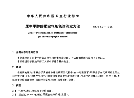 WST 62-1996 尿中甲醇的頂空氣相色譜測定方法 本標(biāo)準(zhǔn)規(guī)定了尿中甲醇的頂空氣相色譜測定方法.本法最低檢測濃度為0.5mg/L.本標(biāo)準(zhǔn)適用于接觸甲醇工... 更新日期:2020-05-09 下載包(1)